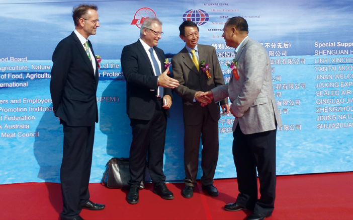 2013年10月13日,第十一屆中國(guó)(青島)國(guó)際肉類(lèi)工業(yè)展覽會(huì)上,大莊園集團(tuán)董事長(zhǎng)陳希濱與世界肉類(lèi)組織主席阿圖羅·拉瓦洛友好交談。